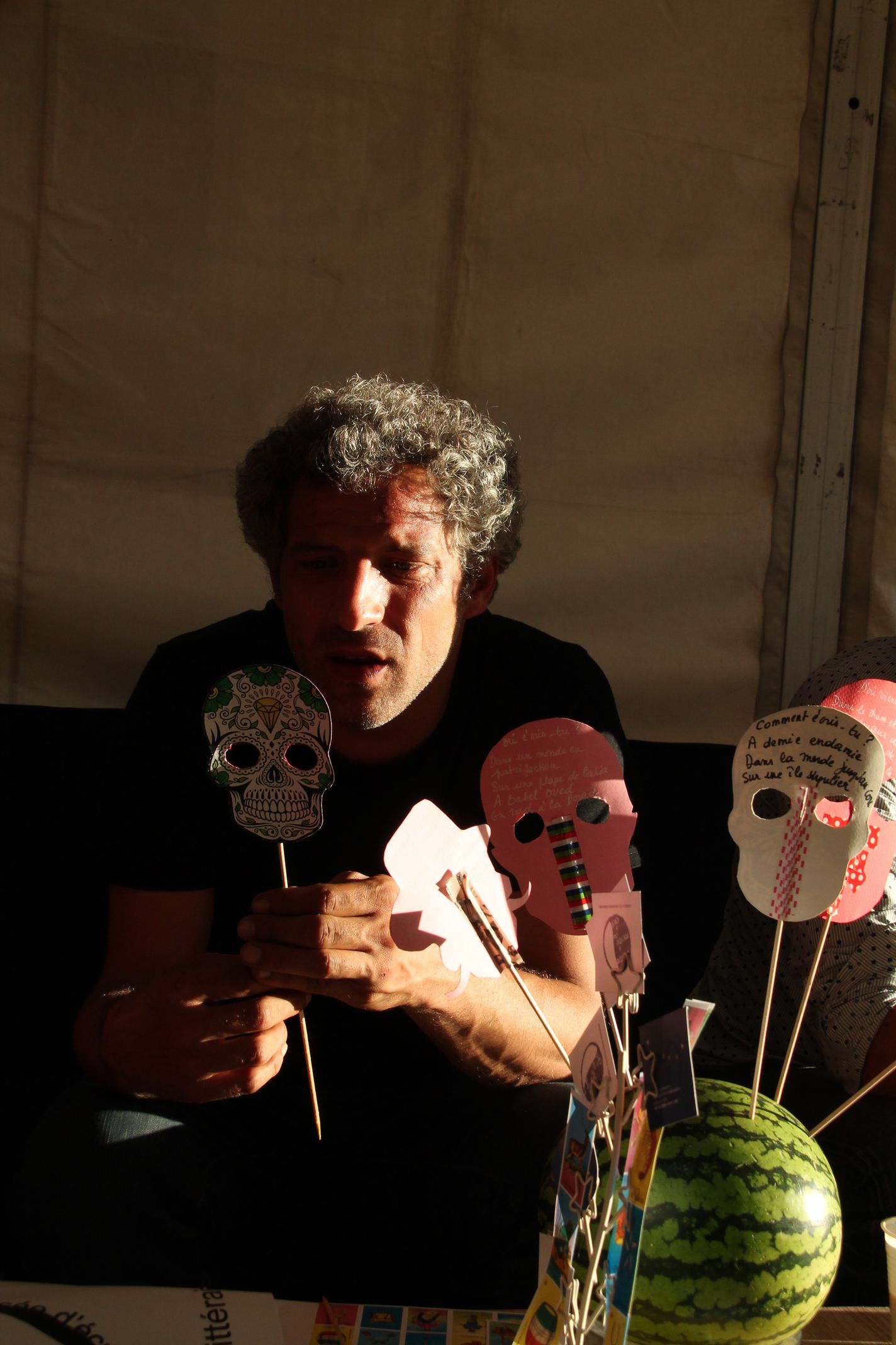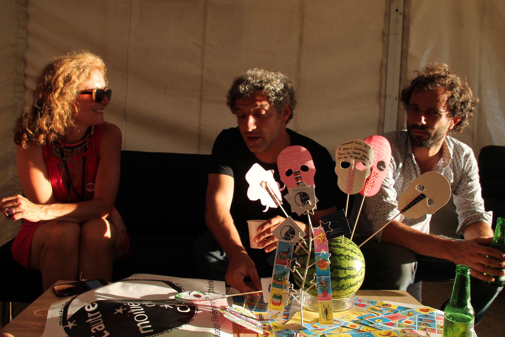 Pour Vincent Sanchez, membre du groupe, les questions sont inscrites sur des petits masques mexicains piqués sur une pastèque.
